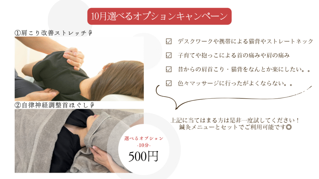 - 9月キャンペーンオプションで使える!!【肩首スッキリ施術500円】"肩甲骨剥がし"キャンぺーン! ※『肩首こり… 続きを読む: 9月キャンペーン