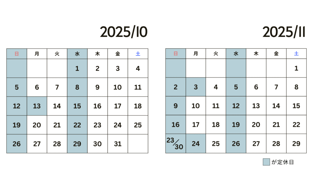 水曜日、日曜日、祝日は定休日です。