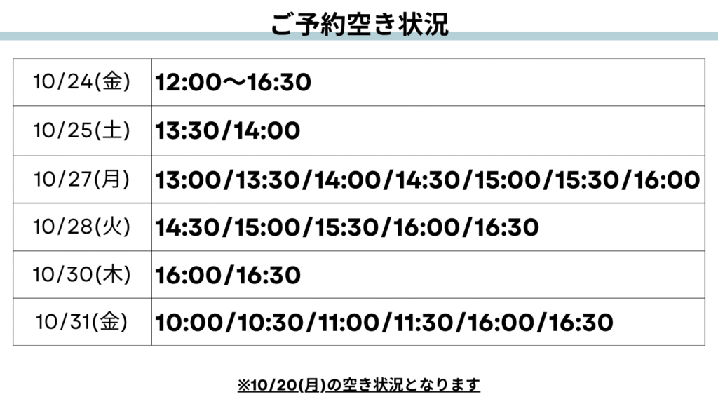 1週間以降~1カ月後のご予約空き状況はInstagramで随時更新しておりますので、そちらをチェックしてください☟