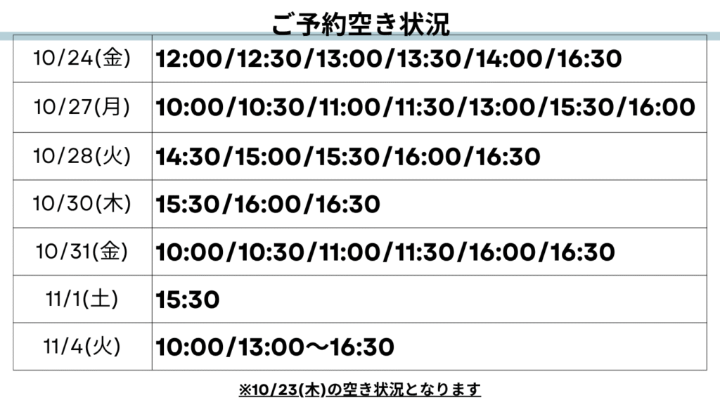 1週間以降~1カ月後のご予約空き状況はInstagramで随時更新しておりますので、そちらをチェックしてください☟