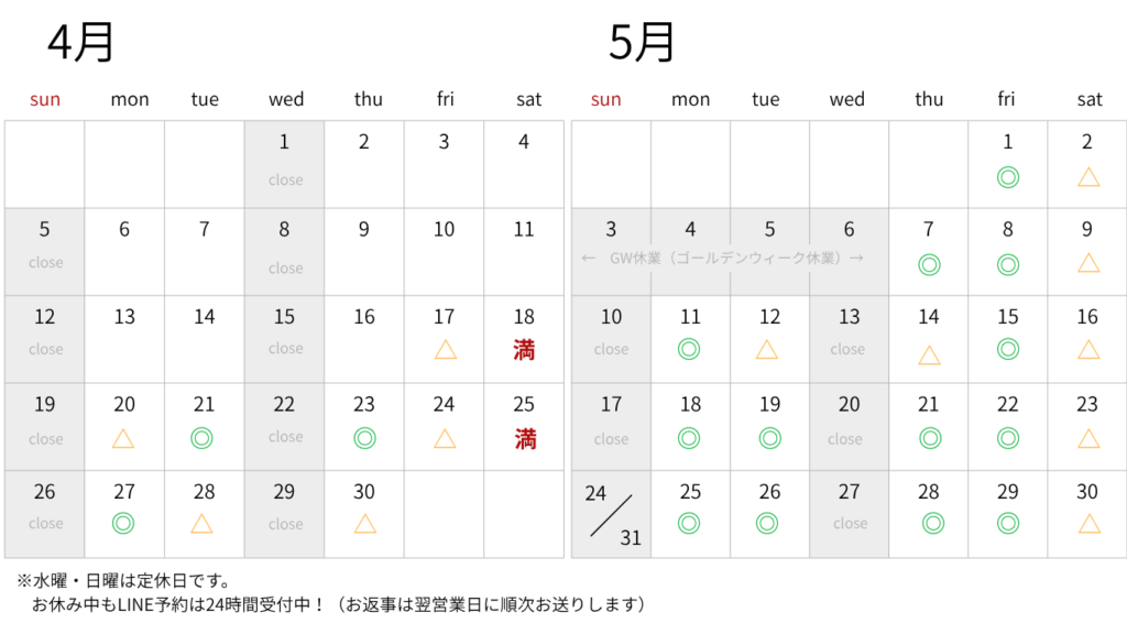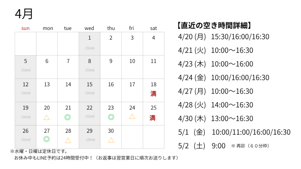 ☟ ご予約空き状況( 4/17(金)9:17更新 )