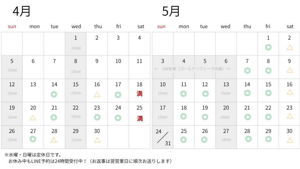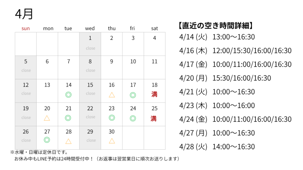 ☟ ご予約空き状況( 4/14(火)9:17更新 )