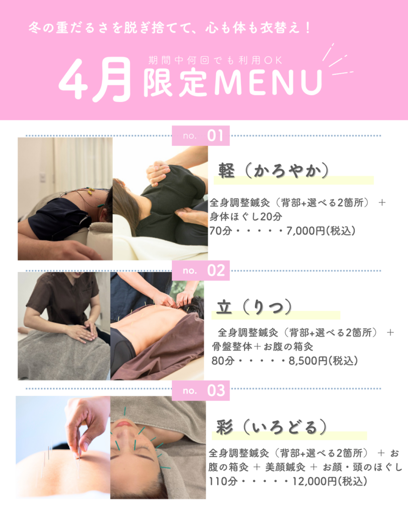 - 【大切なお知らせ】3月・4月の営業と休業日についていつも「めぐり鍼灸院」をご愛顧いただき、誠にありがとうございます。 3月、4月は子供の卒園・入… 続きを読む: 【大切なお知らせ】3月・4月の営業と休業日について