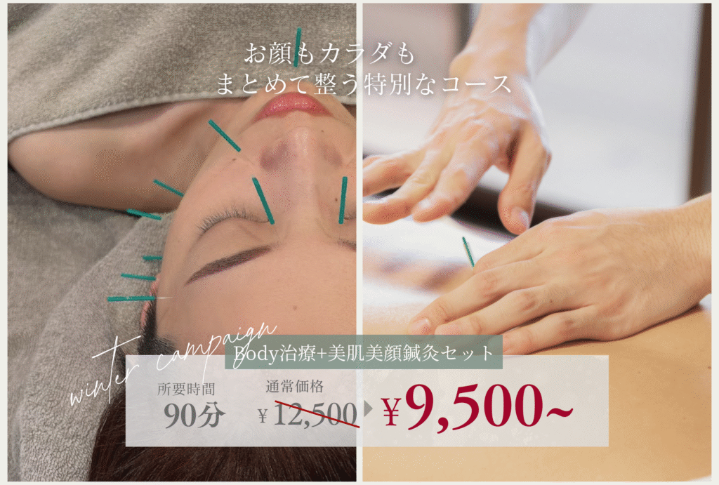 ①美肌美顔鍼灸+全身(鍼灸 or 骨盤 )調整+頭のほぐし